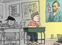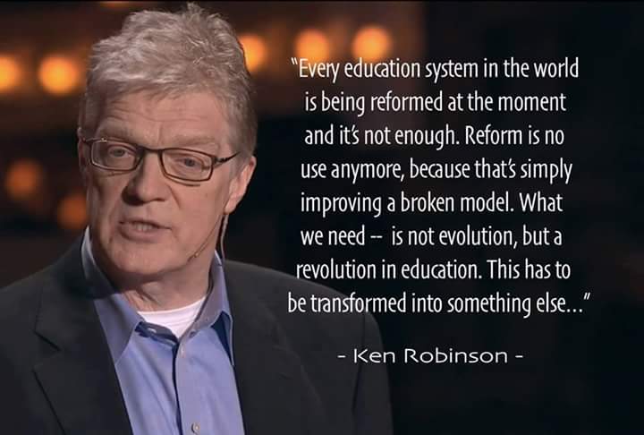 ‘Robinson believes education is “to enable students to understand the world around them, and the talents within them, so that they can become fulfilled individuals and active, compassionate citizens.” He doesn’t deny that learning information about the world is important, but he says it’s equally important for students to understand their own talents, motivations and passions if they are going to lead lives that satisfy them. The current system of conformity and compliance leaves no space for this type of self-exploration.’