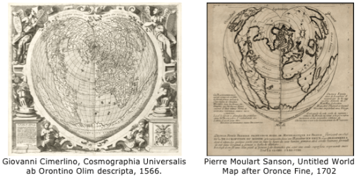 We uncovered other examples of cordiform map projections that obviously take their influence from Oronce Fine’s beautiful cartographic design. The maps below, illustrated by Giovanni Cimerlino and Pierre Moulart Sanson, were done more than a century apart.