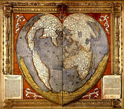 It wasn’t until our students started making heart-shaped worlds as part of a way to promote peace that we wondered if there were any historical references. To our surprise, there were plenty. One of the earliest heart-shaped (cordiform) map projections by Oronce Fine, a French mathematician and cartographer, was created in the sixteenth century. According to Wikipedia, this might have been his most famous illustration and one that influenced other cartographers, such as Peter Apian and Gerardus Mercator.