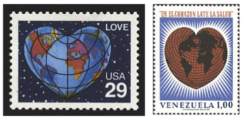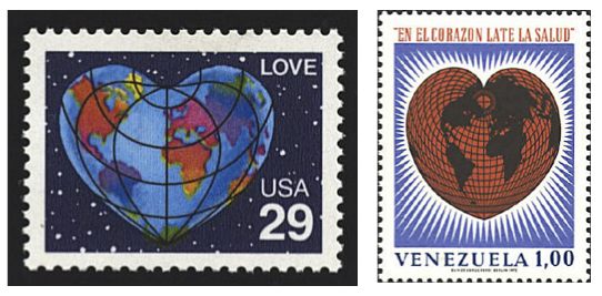 The “Love” stamp from the United States does not necessarily represent a cordiform projection, whereas the stamp from Venezuela celebrating World Health Day more closely resembles the heart-shaped designs from the fifteenth century.