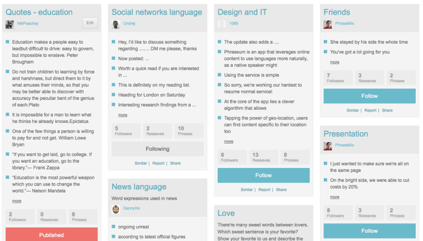 Phraseum also enables you to follow people in a similar way to Twitter or Pinterest. If you follow people you can see their public phrasebooks and keep up-to-date with what they are saving.