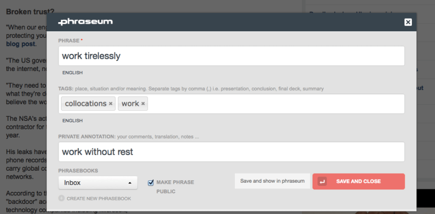 Once that’s done you can just collect any words or phrases that you find online by highlighting them and then clicking on the bookmarklet. This opens up a window where you can add tags to the phrase and add your own private notes and annotations. The tags could be a definition, translation, part of speech or something about the context in which it could be used. You can then save the phrase into one of your phrasebooks. The phrases and phrasebooks can be private or they can be made public and so shared with others.