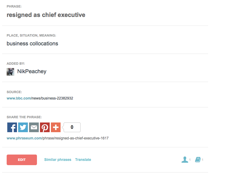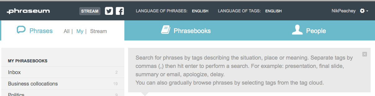 Phraseum is social, so you can share phrases and phrasebooks with anyone else on the site and follow other people if you like the kinds of things they are saving and sharing. You can also click on any of the tags on your phrase to find other related words or phrases which have been saved by other users and add those to your own collection.