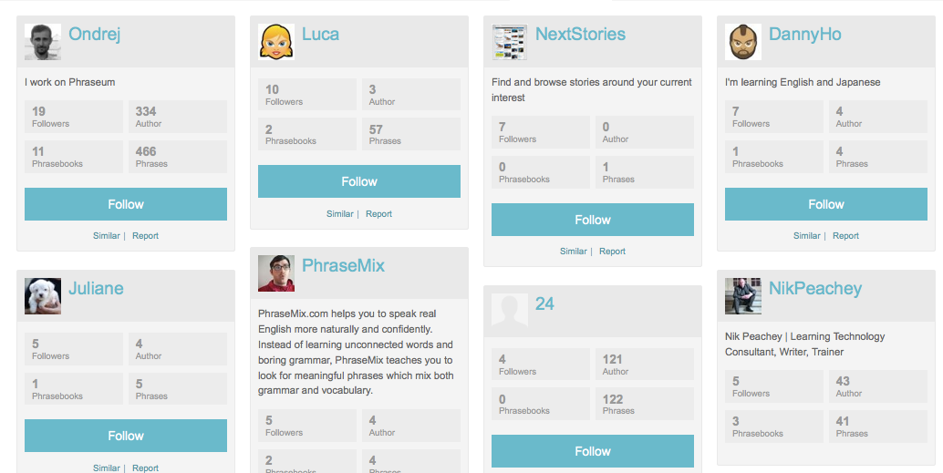 Phraseum also enables you to follow people in a similar way to Twitter or Pinterest. If you follow people you can see their public phrasebooks and keep up-to-date with what they are saving.