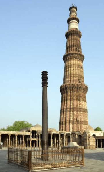 Iron Pillar of King Vikramaditya- it is said that the iron pillar inside the Quwat-ul Islam mosque is of the King Vikramaditya (Chandragupta II), which is 7.21meter high and weighs more than 6 tonnes. It bears an inscription in Sanskrit in Brahmi script dating back to the 4th century CE. The estimated weight of the decorative bell of the pillar is 646 kg and a deep socket on the top of this capital shows that there was an idol of Garuda too.