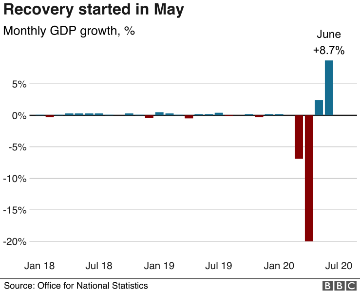 The office of the National Statistics said that the economy bounced back in the month of June when as the restrictions started to ease in the country.On a month on month basis,the economy grew by 8.7% in June after growth of 1.8% in May.