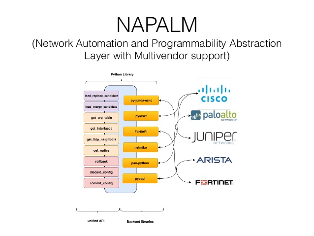 NAPALM (Network Automation and Programmability Abstraction Layer with Multivendor support) is a Python library that can interact with different network devices via a unified API. The software is cross-platform and open-source. It uses different technologies to connect to the network devices, execute configurations, and retrieves the output data. It can support different networking operating systems such as Arista EOS, Cisco IOS, Cisco IOS-XR, Cisco NX-OS, and Juniper JunOS.