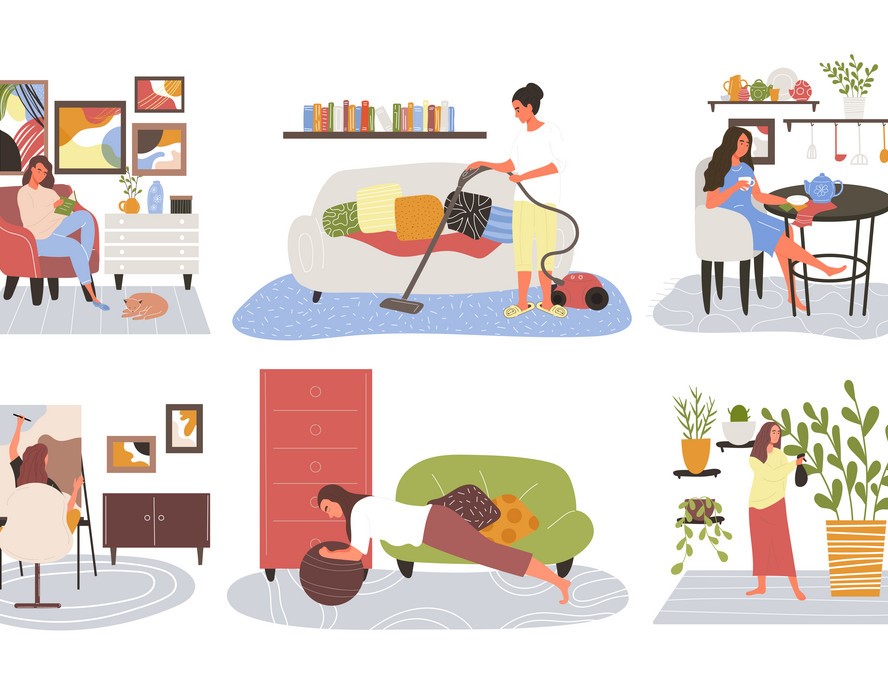 Set of woman doing leisure activities relaxing at home, vacuuming the house, having coffee, exercising at a gym and gardening,