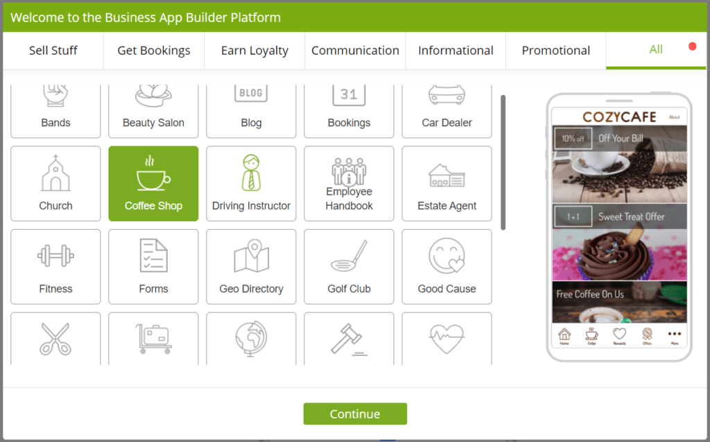 The first step in the app development process is choosing a template. We have templates available for a wide variety of business types, industries, and use cases.