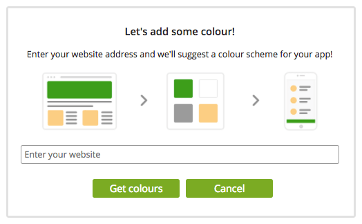 Next, select a color scheme for your template. We make this easy by letting you connect your website to the app builder. We then pull out the colors you already use and suggest a suitable palette for your app that matches your existing branding.