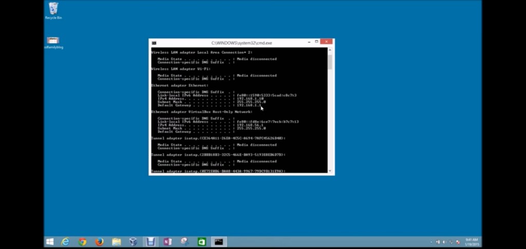 Now you need to get some preliminary information from current network that is setup in your home. First thing you need to do is just hold that window key down on your keyboard and window flag normally the bottom left hand corner of your keyboard in between Ctrl and alt. So you should hold down the windows key and then tap the letter R. This bring up a run box or run prompt. Type CMD then press enter. Now you have a command prompt. Type IP config , press enter. This pull up your some information about current network. You have to pick different IP address (150 or 220) but can’t go higher than 254 for instance 192.168.1.220.