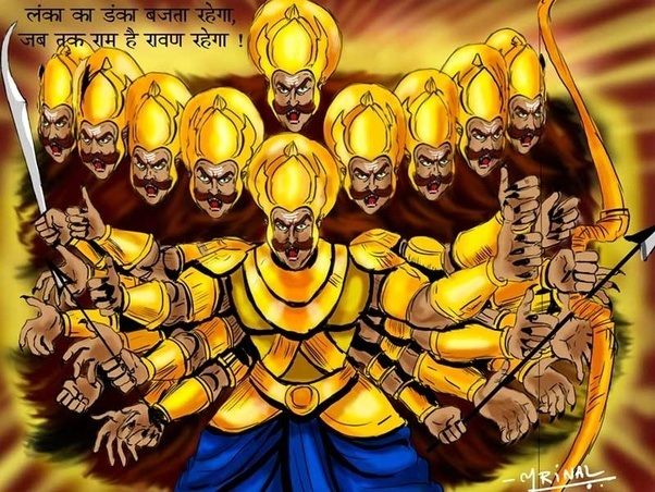 Ravana,the villain of Ramayana,is a rakshasa done a penance for the god Siva for many years.He was the demon king of Srilanka.He is the eldest son of Vishrava and kaikeshi.He is described as having 10 heads and 20 arms.
