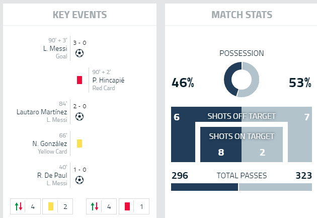 Argentina advance to the semi-finals of the Copa America after being Ecuador 3-0 in their clash at the Olímpico Pedro Ludovico. Rodrigo de Paul opened the scoring in the first half with his first international goal. The Albiceleste had to be patient in the second half, but late efforts from Lautaro Martinez and Lionel Messi secured the win to send them into the last four. Ecuador battled hard, but lacked the quality before defender Piero Hincapie ended his tournament on a low note by receiving a red card.