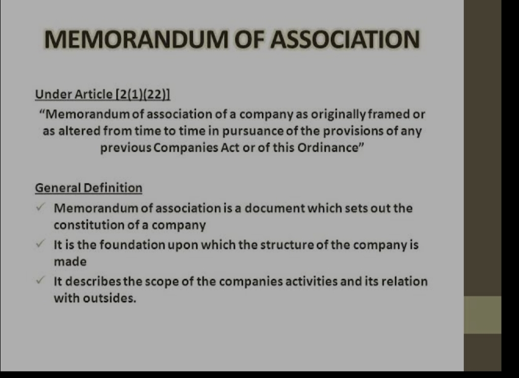 “The Memorandum of Association of a company is it’s charter and it defines the limitations of the power of the company . The memorandum contains the fundamental conditions upon which alone the company is allowed to be incorporated.”