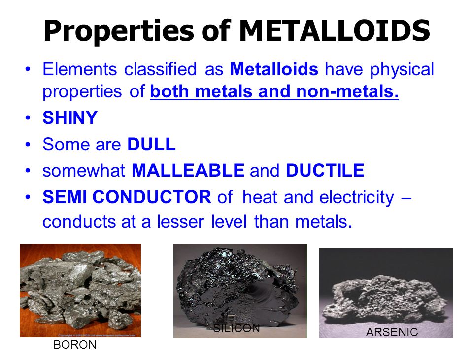 The physical properties of metalloids tend to be metallic, but their chemical properties tend to be non-metallic.