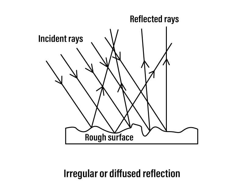In case of a body having a rough or irregular surface, each region of the surface is inclined at different angles. When light falls on such a surface, the light rays are reflected at different angles. In this case, the angle of incidence and the angle of reflection of each ray are not equal. Hence, the law of reflection is not obeyed in this case and thus the image is not clear. Such a reflection is called ‘irregular reflection’ or ‘diffused reflection’.