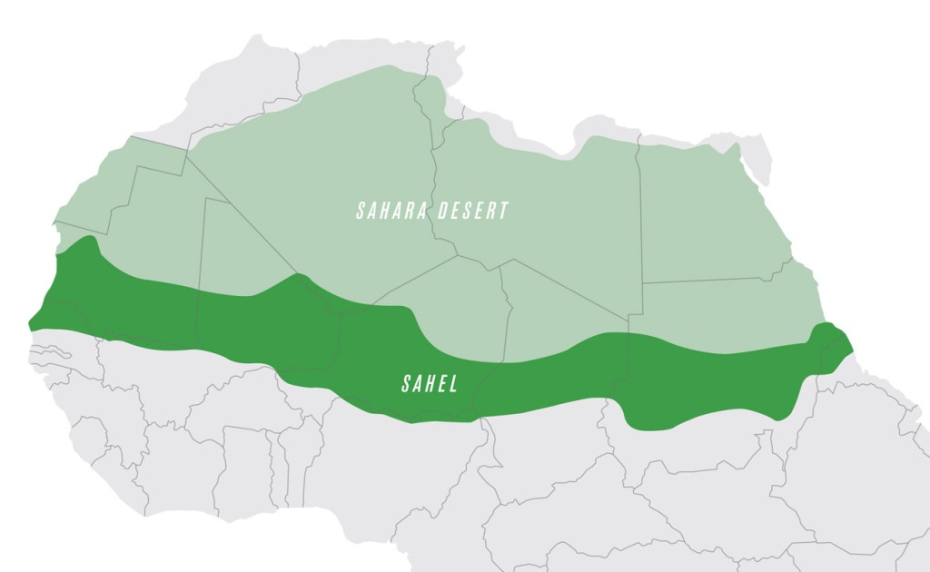 At the southern border of the Sahara lies a semi-arid grassland known as the Sahel. It’s a buffer zone between the harsh Sahara and the fertile savannas in southern Africa, particularly Sudan and Chad. Lake Chad, for example, has been getting smaller due to climate fluctuations and because its used to irrigate crops. The lack of rainfall does not help the situation.