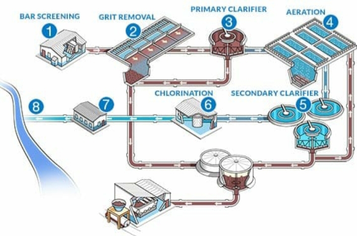 The physical process of wastewater treatment begins with screening out large items that have found their way into the sewer system, and if not removed, can damage pumps and impede water flow. A bar screen is usually used to remove large items from the influent and ultimately taken to a landfill.