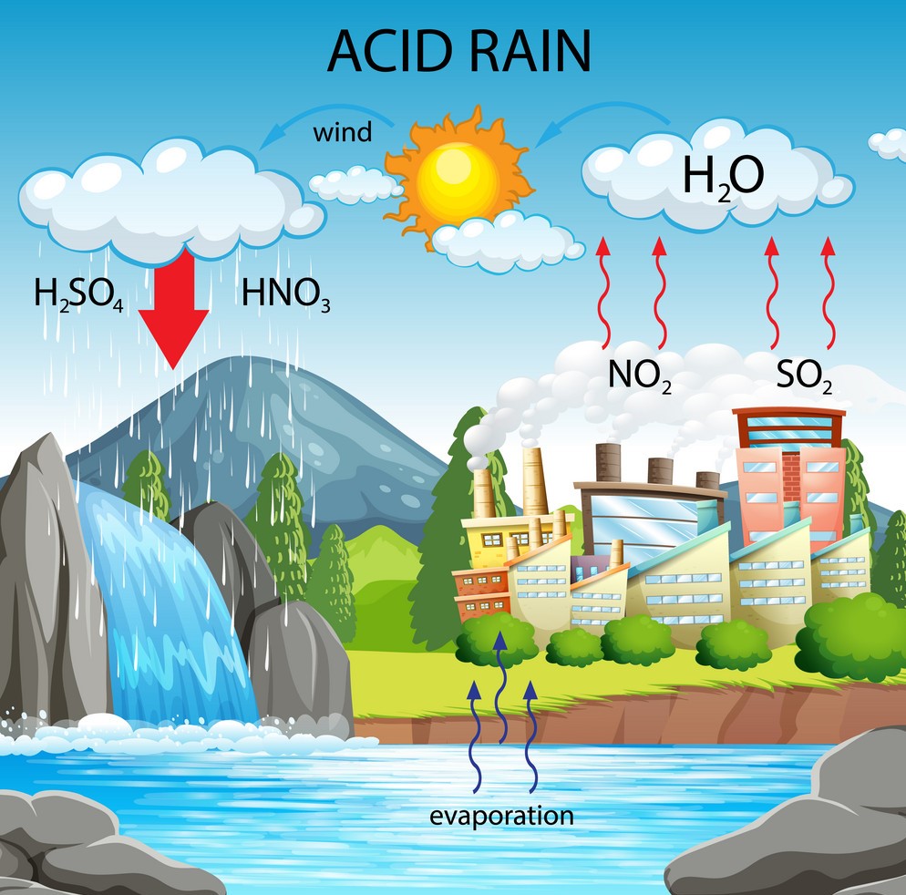 Rain is never just composed of water. Chemicals and particulates in the atmosphere can be found in every drop, and some compounds like carbon dioxide make even regular rainfall slightly acidic. But this pales in comparison to the powerful acids produced when water interacts with oxides of nitrogen or sulfur dioxide. On the pH scale which measures acidity, each whole number is ten times more acidic than the one above it. And where normal rain has a pH of roughly 5.4, rain that’s interacted with these gases(carbon dioxide, sulfur dioxide or oxides of nitrogen) can rank as low as 3.7. Oxides of nitrogen and sulfur dioxide can appear naturally as a short-lived byproduct of volcanic eruptions or lightening strikes. But power plants, refineries and vehicles that use fossil fuels consistently pump large quantities of these harmful gases into the air. These dangerous gases travel with the wind spreading hundreds of kilometers from the pollution’s source. Acting like roaming clouds of destruction, their presence dramatically increases the acidity of local precipitation, creating acid rain, acid snow and acid fog. These all acidify lakes and streams, kill crops and forests, and damage soil to inhibit future growth on it. Overtime, acid rain can even corrode human structures made up of stone or metal.