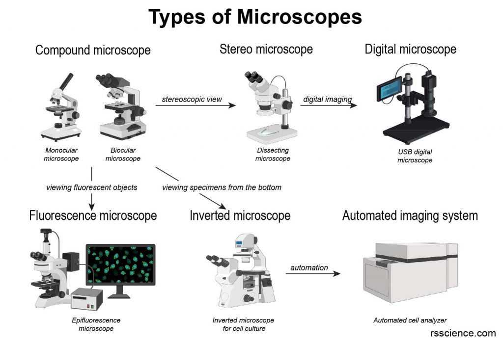 The most familiar type of microscope is the optical, or light, microscope, in which glass lenses are used to form the image. …… Other types of microscopes use the wave nature of various physical processes.