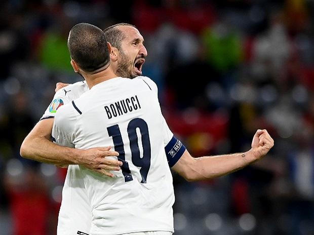 In the pic (Leonardo Bonucci and Giorgio Chiellini of Italy celebrate after defeating Belgium 2-1 in the quarters to set up a semi-final clash against Spain)