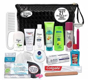 A  21-Piece Necessities travel kit with shampoo, soap, creams, and other gear.A 21-piece necessities kit is perfect for travellers or those who love to sample newer products on the go. You can fill it up with everything you need, from shaving necessities, travel toothbrushes, sleeping masks, earplugs, and more. You’ll find everything you need to make travelling easier and your stay more restful.