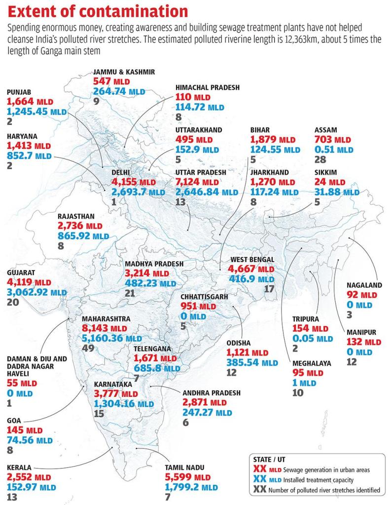 Only having a large number of sewerage projects and STPs will not clean the rivers. An analysis of 71 cities by Centre for Science and Environment (seventh State of India’s Environment report – Excreta Matters) has shown that sewerage systems are not seen as connected to rivers. The analysis says that a piece of “hardware” is installed and if the water utility does not have money, the hardware does not run.