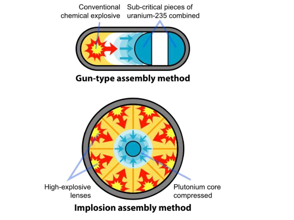 Another engineering challenge is to create a vessel with the correct shape and material to contain the neutrons after fissioning, so that they do not escape, but rather cause more atoms to fission. And it is lined with a special mirror so that it forces neutrons back in to the fissionable material rather than escape the vessel. Then the correct amount of fissionable material has to be placed inside this vessel. This is called ‘super critical mass’. There has to be enough mass to sustain an uncontrollable chain reaction resulting in an explosion. The super critical mass has to be kept apart until you are ready for an explosion. Otherwise an explosion can occur when you don’t want it. The reason is because these isotopes are unstable, and are throwing off neurons randomly. In an atomic bomb, two sub-critical masses are slammed together usually with a conventional bomb contained inside the outer bomb. This conventional explosive charge initiates the chain reaction. This project ultimately created the first, man-made nuclear explosion, which Robert Oppenheimer called “trinity” on July 16, 1945. The concept of an atom bomb is simple but, the process of actually creating a bomb is not so simple.