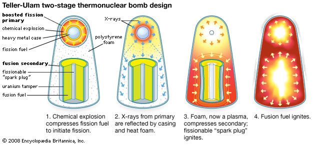 At 8:15 on the morning of 6th august 1945, all people saw was a blinding light followed by complete darkness and destruction. It was the most powerful weapon ever created by mankind. It unleashed energy and radiation that killed a hundred and forty thousand people in the industrial city of Hiroshima, Japan. Today we have thermonuclear weapons, also called as the hydrogen bomb. Edward Teller, a Hungarian physicist, worked on the Manhattan project to produce the first atomic bomb based uranium fission, teller had long been interested in a hydrogen fusion bomb, but secrecy and the lack of access to computers contributed to slow progress. Stanislaw Ulam, a polish mathematician realized that a fission bomb could be used as a trigger for a fusion reaction. It is believed that teller seized on this for what became, in 1951, the “Teller-Ulam” design. Most sources agree that the H-bomb works in a series of stages, occurring in microseconds, one after the other. A narrow metal case houses two nuclear devices separated by polystyrene foam. One is ball shaped, the other is cylindrical. The ball is essentially a standard atomic fission bomb. When this is detonated, high energy radiation rushes out ahead of the blast.