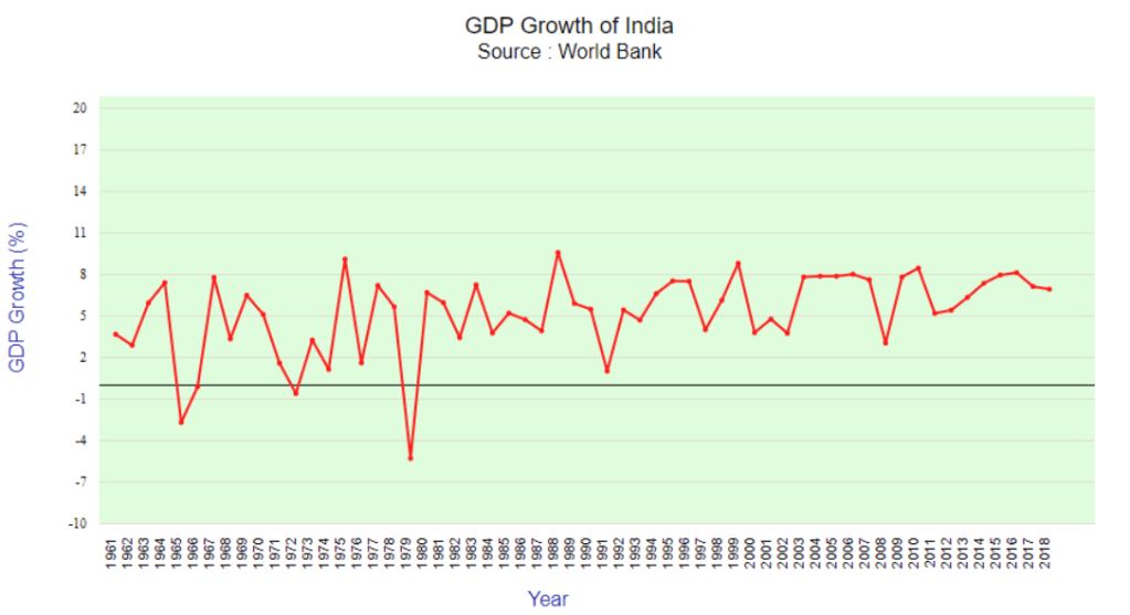 India started recovery in 2013–14 when the GDP growth rate accelerated to 6.4% from the previous year’s 5.5%. The acceleration continued through 2014–15 and 2015–16 with growth rates of 7.5% and 8.0% respectively. For the first time since 1990, India grew faster than China which registered 6.9% growth in 2015. However the growth rate subsequently decelerated, to 7.1% and 6.6% in 2016–17 and 2017–18 respectively, partly because of the disruptive effects of 2016 Indian banknote demonetisation and to goods and service tax India. India’s GDP growth has been slowing rapidly, from a high of 8.3% in 2016 to just 4.2% in 2019.