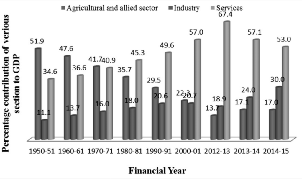 Historically, India has classified and tracked its economy and GDP in three sectors: agriculture, industry, and services.
