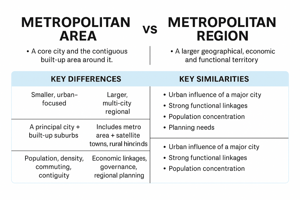 This study demonstrates that metropolitan areas and metropolitan regions, though closely related, operate at fundamentally different spatial, functional, and governance scales. The metropolitan area reflects the compact, contiguous, and densely urbanised core of a city, shaped by population concentration, daily mobility patterns, and localised planning needs such as zoning, intra-city transit, and densification. In contrast, the metropolitan region represents a significantly wider and more complex territorial system driven by economic corridors, inter-city mobility, peri-urban growth, and multi-jurisdictional governance structures. It encompasses satellite towns, rural hinterlands, logistic networks, and dispersed urban nodes that together form a functionally integrated regional economy.