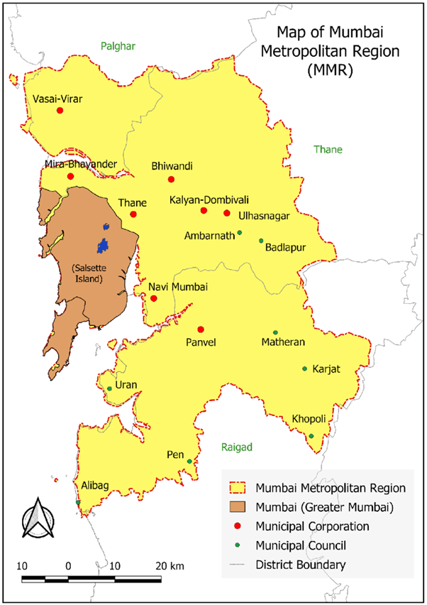 | Mumbai Metropolitan Area (India) | Greater Mumbai + continuous built-up areas (e.g., Mumbai, Thane). | Mumbai Metropolitan Region (MMR): Mumbai, Navi Mumbai, Thane, Kalyan-Dombivli, Vasai-Virar, and growth centres. | Polycentric expansion, extensive commuting flows, and significant environmental spillovers across coastal and inland regions. | Calderón-Garcidueñas et al. (2025); Fang et al. (2025) |