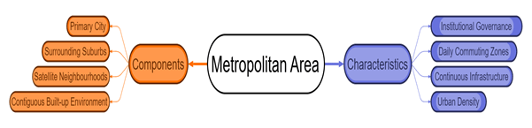 At its core, a metropolitan area consists of three essential components: (i) the primary city, which acts as the central node of governance, employment, services, and cultural functions; (ii) adjacent suburbs and secondary neighbourhoods whose growth is closely tied to the expansion of the core city; and (iii) a contiguous built-up fabric that ensures physical continuity across the entire urban footprint. This continuity differentiates metropolitan areas from metropolitan regions, as the latter encompass discontinuous settlement clusters and multiple urban nodes.