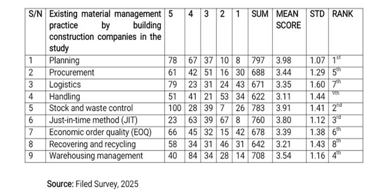 A. Planning (Rank 1, Mean Score: 3.98, Std Dev: 1.07): Planning emerged as the most highly ranked practice among the respondents. With a mean score of 3.98, it indicates that most construction companies prioritize careful preparation and scheduling of materials before and during project execution. The relatively low standard deviation (1.07) suggests that respondents had a fairly consistent view regarding the importance of planning. Effective planning ensures that materials are available when needed, reducing delays and inefficiencies on construction sites.