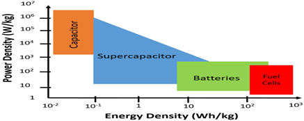 In recent days automobile sector mostly relies on lithium-ion batteries due to higher energy density and safe during handling. Lithium is a key part of batteries that runs electric vehicles but due to limited availability of lithium it really hard to keep up with demand and supply. Researchers are continuously working on replacement of lithium to alkali metals like sodium cause abundant in nature and low cost but sodium ion batteries having poor cyclic performance.[3] In comparison to batteries supercapacitor having some positive features like fast charging- discharging cycles. Supercapacitor require 1-10 s and batteries require 0.5-5 hr. charging -discharging time. Power density defines how quickly energy can be delivered or receive per unit mass (W/kg): supercapacitor having higher power density 500-10000 W/kg and batteries having power density less than 1000 W/kg. Supercapacitor have longer lifetime more than 500,000 hrs. and batteries 500-1000 hrs. Energy density defines amount of energy stored per unit mass: energy of batteries 10-100 Wh/kg more than supercapacitors 1-10 Wh/kg.[4] The Ragone plot shown in graph 1. provide the information about behavior of electrochemical energy storage devices power density and energy density.[5]