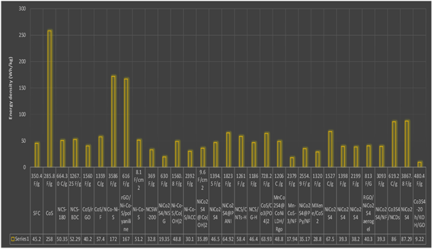 Sheet-like nickel cobalt sulfide nanoparticles synthesize by a two-step hydrothermaltechnique provide rich sulfur vacancies.NiCo2S4 nanosheets provide good specific capacitance of 971 Fg-1 at 2 A g-1 and an excellent cyclic stability of 88.7% after 3500 cycles.[41] By facial solvothermal method mixed nickel-cobalt sulfide (NCSs) prepared for supercapacitor application. The mixed NCS prepared at a nickel: cobalt molar ratio of 3:1 exhibited a specificcapacitance of1345 Fg-1 at a current density of 2 A g-1 with 95% of its initial capacitance after 3000 charge-discharge cycles.[42] Cobalt sulfide composes with different metals such as copper Cu and manganese Mn fabricated by hydrothermal method on nickel foam provide a unique morphology of nanoflakes of different texture. Mn-CoS-3/NF boost the specific capacitance of 2379 F g-1 at 1 A g-1 with capacitance retention about 65% after 5500 cycles comparing to 48% of CoS-3/NF and 55% Cu-CoS-3/NF. Mn-CoS-3/NF deliver high surface area, low internal resistance, flaky nanostructure. Mn-CoS-3/NF//AC/NF device deliver energy density of 17.94 Wh kg-1 and power density of 6405 W kg-1.[43] Twostep hydrothermal method used to synthesis of cobalt sulfide layered flower-like morphology binder-free Co9S8 electrodes deposited onto nickel foam with an enhanced specific capacity of 1611.87 F g-1at 1 mA cm–2.[44]CoS/G nanocomposite successfully synthesize by one pot hydrothermal method. CoS nanosphere offers specific capacitance of 390 F g-1 and CoS on graphene shows excellent specific capacitance 739.83 F g-1 with capacitance retention of 91.2 % after 3000 cycles.[45] Dandelion likeNiCo2S4@PPy/NF microsphere synthesize by hydrothermal method. Electrode shows remarkable specific capacitance of 2554.9 F g−1 at 2.54 A g−1 with capacitive retention of 92% after 10000 cycles. Device delivered an energy density of 35.17 Wh kg−1 at a power density of 1472 W kg−1.[46]Electrochemical performance of MXene tune by CoS synthesize on Mxene by one step solvent thermal method. Delivered a specific capacitance of 1320 F g−1 at a current density of 1 A g−1 and it shows cyclic performance with 78.4% after 3000 cycles device delivered an energy density 28.8 Wh kg-1 and 800 W kg-1.[47] A simple two step hydrothermal process utilize to prepared a binder-free graphene-nanosheets wrapped Co3S4 hybrid electrode is prepared on conductive Ni-foam. structure of the Co3S4-rGO shows a specific capacitance of 2314 F g−1 with 92.6% cyclic stability after 1000 cycles. Device delivered energy density of 54.32 Wh kg-1and power density of 6250 W kg-1.[48]A two-step hydrothermal method uses to synthesize nickel and cobalt sulfide with different ratios of nickel and cobalt. NC24 sample with the Ni/Co ratio of 1:2 hollow nanotube arrays composed of NiCo2S4 provides nanorod array structure which gives excellent specific capacitance of 1527 C g−1 at 1 A g−1 with capacitive retention of 93.81% after 2000 cycles. Symmetrical supercapacitor from this electrode delivers high energy density of 67.5 Wh kg-1.[49]