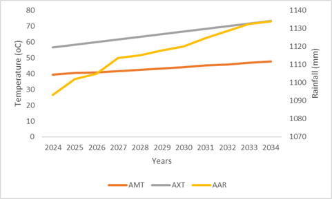In contrast to the temperature trends, annual rainfall is projected to follow a relatively stable but modestly increasing pattern, rising from 1,093.17 mm in 2024 to 1,134.06 mm by 2034. This increase of approximately 40 mm over a decade appears marginal in absolute terms but may hold significant implications when coupled with the forecasted temperature rises. Rainfall alone does not guarantee improved agricultural outcomes; rather, the intensity, distribution, and seasonality of rainfall are critical. Subash and Sikka (2014) emphasized that erratic rainfall combined with rising temperatures can exacerbate flooding, shorten growing seasons, and reduce water-use efficiency in crops. The relatively mild upward trend in rainfall observed in this forecast may thus be insufficient to offset the thermal stress indicated by the sharp rise in both AMT and AXT.