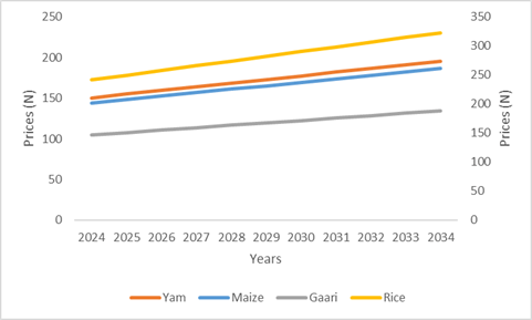 The ARIMA forecasting models applied to yams, garri, rice, and maize prices yielded a consistent upward trend for all commodities over the projection period from 2024 to 2034. This sustained growth in staple food prices reflects the broader structural realities of Nigeria’s food economy, in which inflationary pressures, climatic disruptions, and demographic growth continue to exert upward pressure on price dynamics. The result is presented in Table 3 and Figure 2.