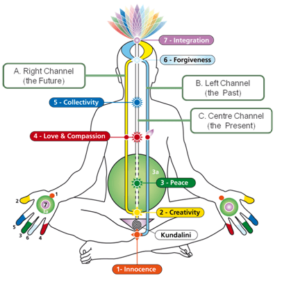 The meditation itself starts with balancing. There are two sides of our subtle system that is left, right and centre. The Left side is all about our emotions or the ‘Ichha Shakti’, our past activities. While the right side is all about our work also called as ‘Kriya Shakti’ and our future. And the central path is all about our present, about the truth, it is the path of our evolution. It gives us the absolute peace. In the lower part of our the abdomen, in the triangular part of our secrum bone is the Kundalini, it is the power of pure desire within us. When it rises, it passes through our central channel and peerses out of the fontanel bone area at the top of our head and gets connected to the all pervading power in the whole universe. We feel the cool breeze at the top of our head and on our hands. This moments gives us complete thoughtless awareness state and absolute peace.