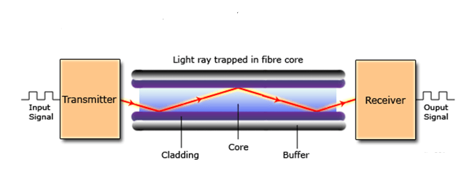 -Optical fiber transmits a signal-encoded beam of light by means of total internal reflection. -Total internal reflection can occur in any transparent medium that has a higher index of refraction than the surrounding medium. -In effect, the optical fiber acts as a waveguide for frequencies in the range of about to this covers portions of the infrared and visible spectra. -Act as wave guide for 1014 to 1015 Hz