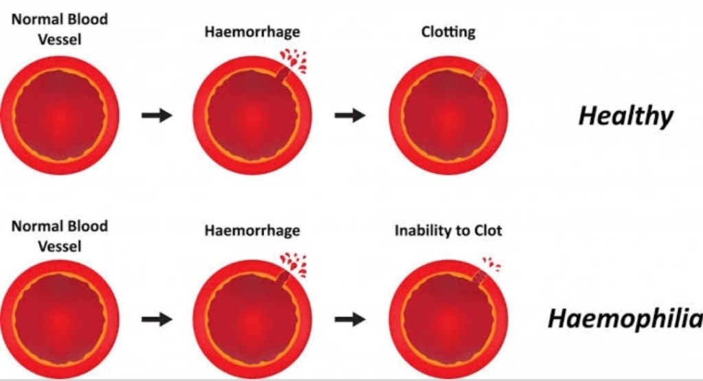 This sex linked recessive disease, which shows its transmission from unaffected carrier female to some of the male progeny has been widely studied. In this disease, a single protein that is a part of the cascade of proteins involved in the clotting of blood is affected. Due to this, in an affected individual a simple cut will result in non- stop bleeding.
