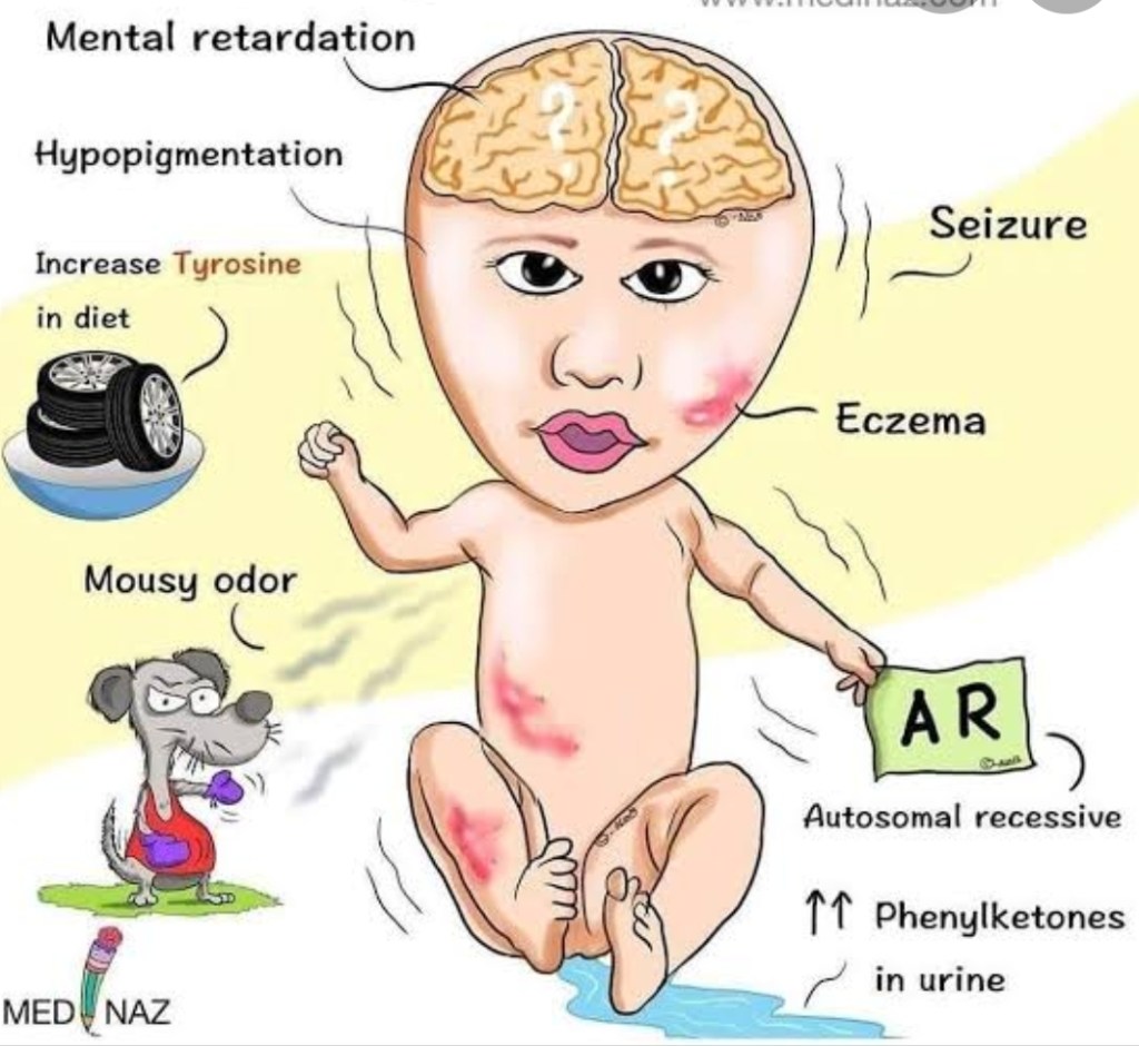 This inborn error of metabolism is also inherited as the autosomal recessive trait.the affected individual lacks an enzyme that converts the amino acid phenylalanine into tyrosine. As a result of this phenylalanine is accumulated and converted into phenylpyruvic acid and other derivatives.