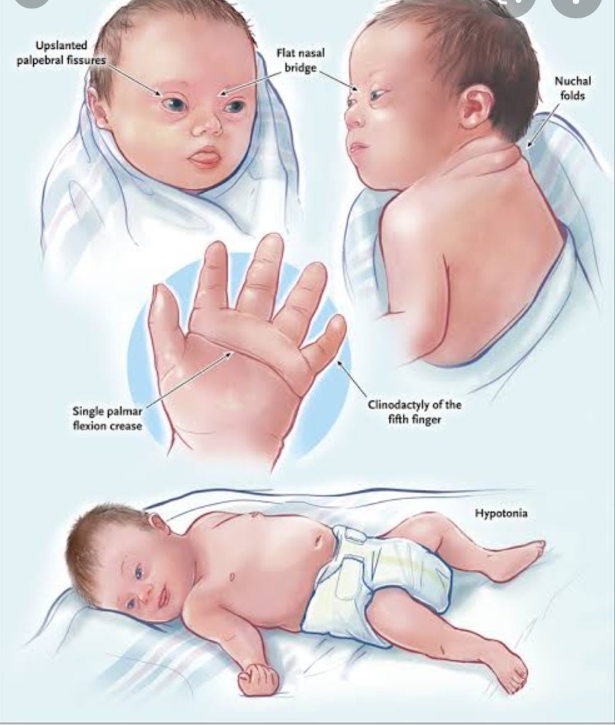 The affected individual is short statured with small round head, furrowed tongue and partially open mouth. Palm is broad with characteristic palm crease. Physical, psychomotor and mental development is retarded.