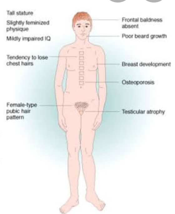 This genetic disorder is also caused due to the presence of an additional copy of X-chromosome resulting into a karyotype of 47, XXY. Such an individual has overall masculine development, however, the feminine development (development of breast) is also expressed. Such individuals are sterile.