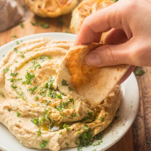 Starting with probably the best known Middle Eastern food, it is a dip, spread, or savory dish made from cooked, mashed chickpeas blended with tahini, lemon juice, and garlic. It is usually eaten as a dip, with pita bread or also known as khubz in arab.