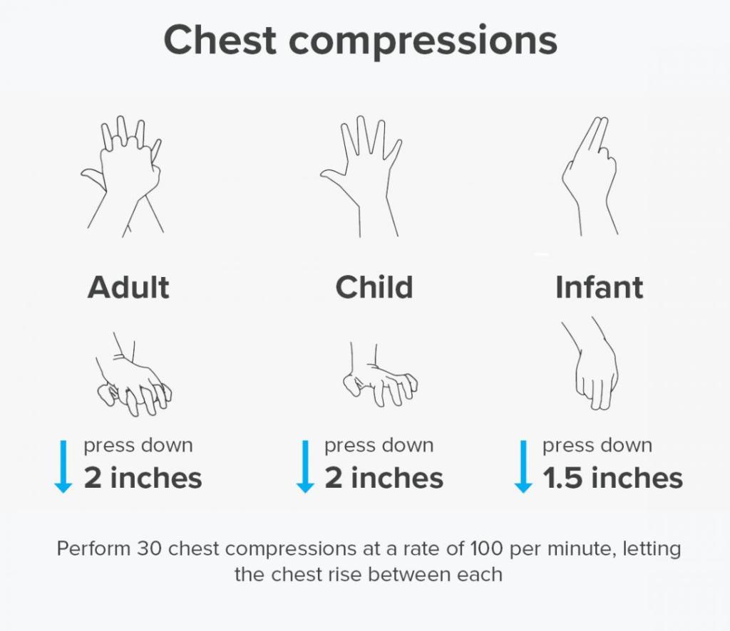 Place one of your hands on top of the other and clasp them together. With the heel of the hands and straight elbows, push hard and fast in the center of the chest, slightly below the nipples. Push at least 2 inches deep. Compress their chest at a rate of least 100 times per minute. Let the chest rise fully between compressions.