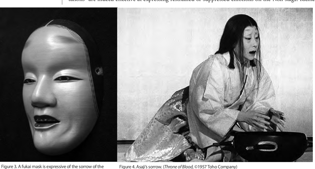 Contrarily, in the movie, Lady Asaji (the equivalent to Lady Macbeth) makes it much more subtle entrance. She is first seen sitting peacefully in Washizu’s castle appearing as submerged in deep contemplation. Throughout her attempts to convince Washizu to kill Tshuzuki, she remains completely sedentary and shows no sign of any emotion, unlike Lady Macbeth who passionately uses strong imagery and vehement speech to ty to persuade Macbeth. And Asaji’s fixed expressions portray the use of Noh mask. As far as the movie is concerned, predominantly the character of Asaji, Kurosawa has adopted the aesthetic of the Noh elements.