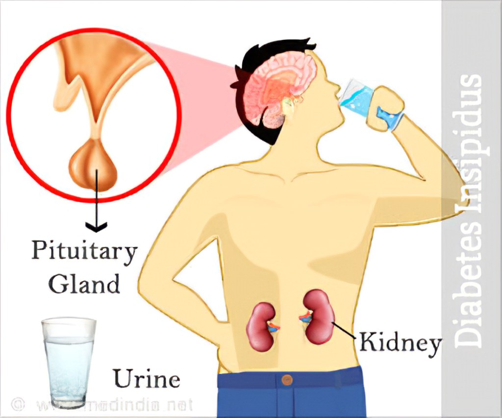 Diabetes insipidus is an uncommon disorder that causes an imbalance of fluids in the body. This imbalance leads to the production of large amount of urine. It also makes the person feel very thirsty even if they have something to drink. While the terms “Diabetes mellitus” and “Diabetes insipidus” sound similar but they are not. Diabetes mellitus- involves high blood sugar levels and can occur as type 1 or type 2 is very common whereas Diabetes insipidus involves excess of urination and is very rare.