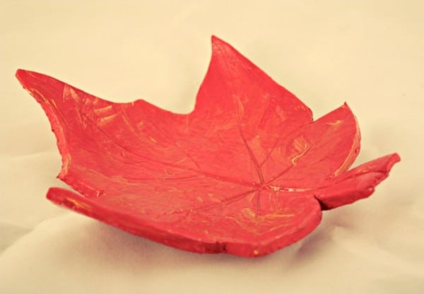 1.Start with a fist sized lump of potters clay. Review and complete wedging of the clay. 2.Simply roll the clay into 1/4″ slabs using rolling pins and two guide sticks which help you get an even result. 3.Place a large leaf over the clay- facing up so that the veins are down. Go over with the rolling pin to make an imprint. 4.Use the knife to trim around the leaf. 5.Smooth the rough edges with one finger and a bit of water. 6.Lay some plastic wrap, a paper towel or a thin cotton cloth inside of a disposable paper bowl. Lay your clay leaf inside of the bowl and gently press it down to take its new shape. 7.Dry for several days and then paint.